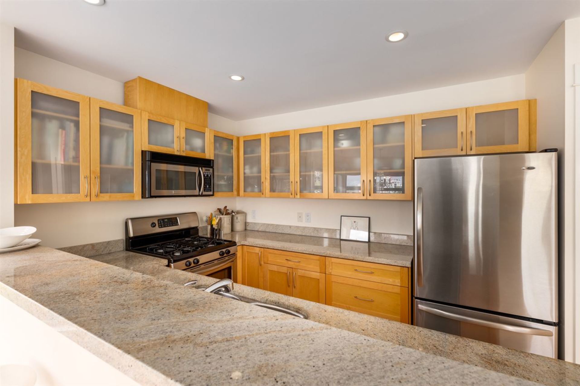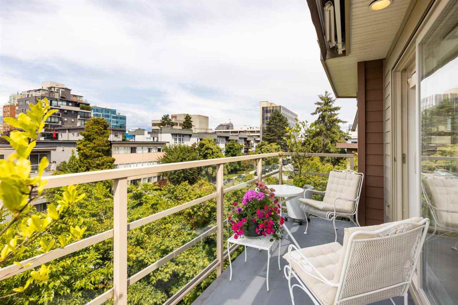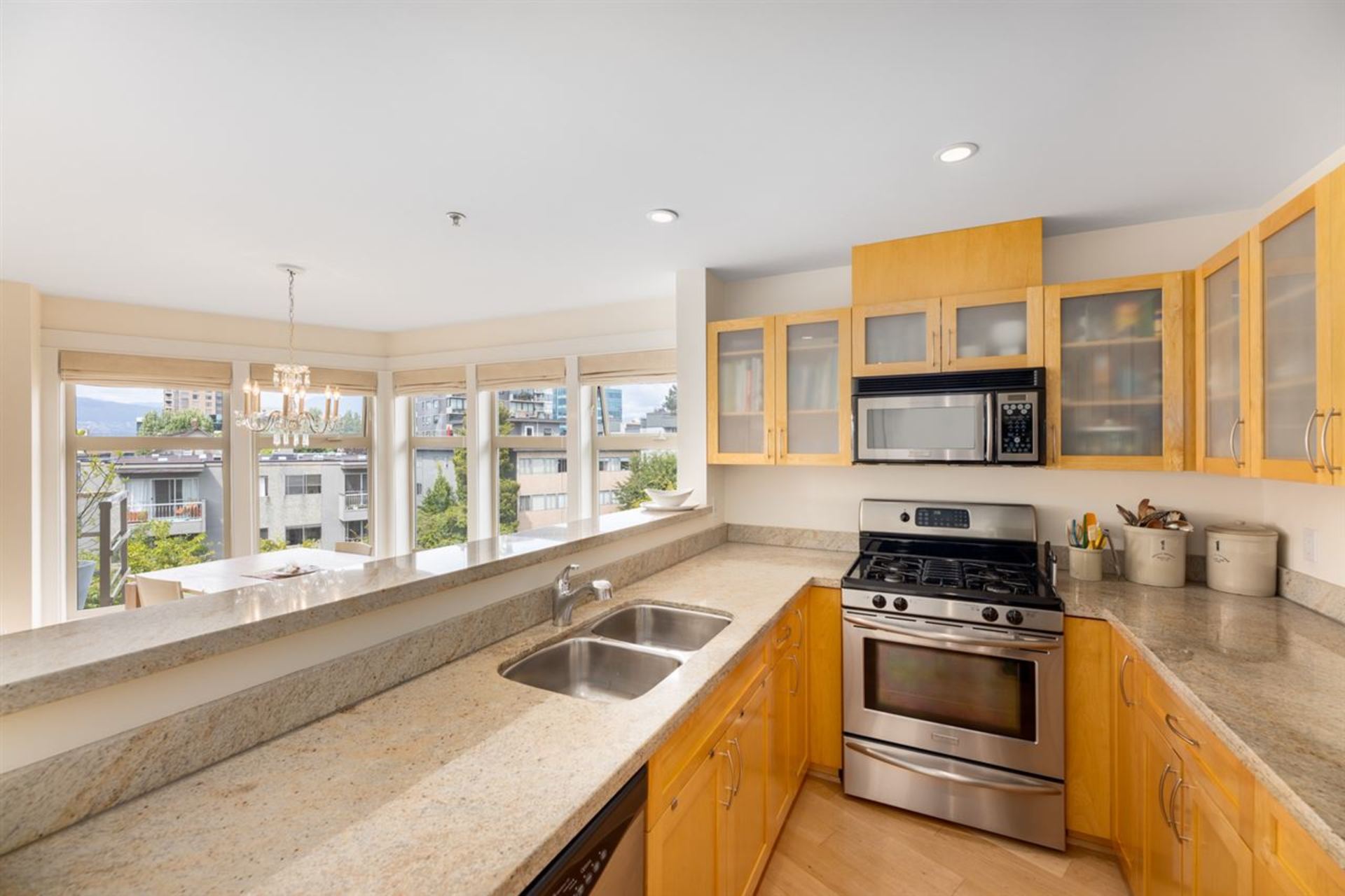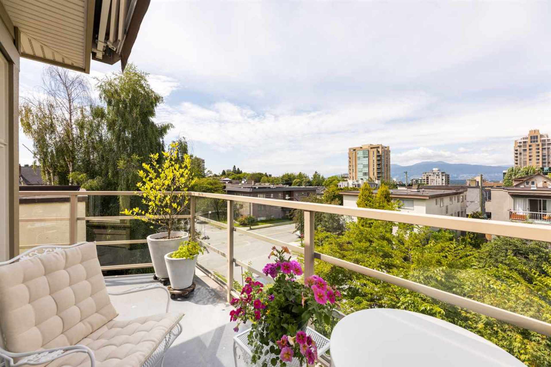 Unique Penthouse at “Torrey Pines,” a luxurious 8-unit boutique building with only 2 homes per floor located in South Granville, and on a tree-lined private street.Superb layout with architectural detailing throughout: wood flooring in all rooms, large windows, skylight, & wrap around 170 sq.ft. patio.2 generous sized bedrooms, 180 degree East, North and Western exposure allowing for plenty of light, mountain views & beautiful sunsets.Customized high quality kitchen with Fir cabinets, granite counters, stainless steel appliances & gas range. Charming gas fireplace in the large living area, custom linen blinds, ample sized dining area, all connecting to a pleasant patio space. Georgie Award-Winning development in a private and quiet setting that comes with 2 secure parking stalls and 1 locker.